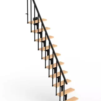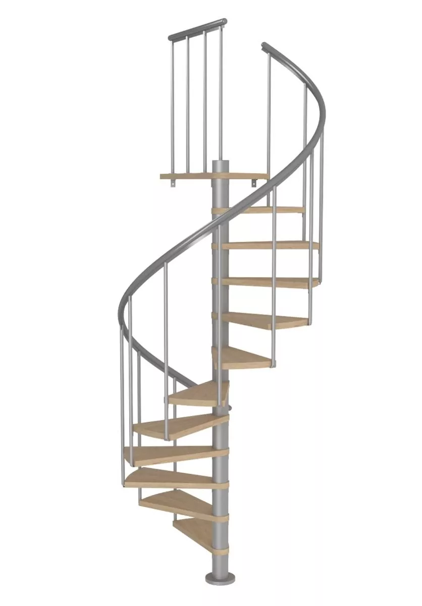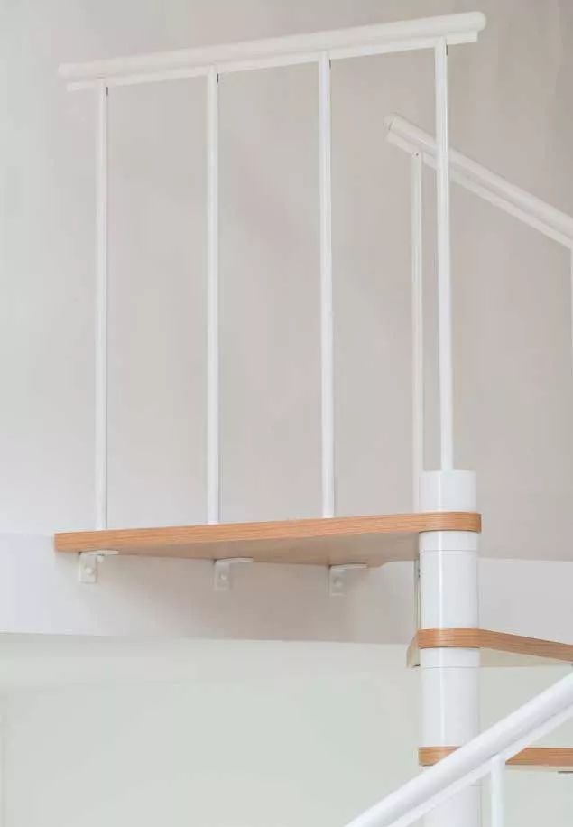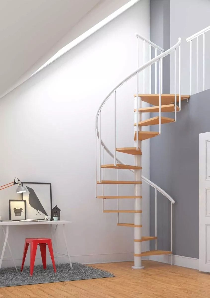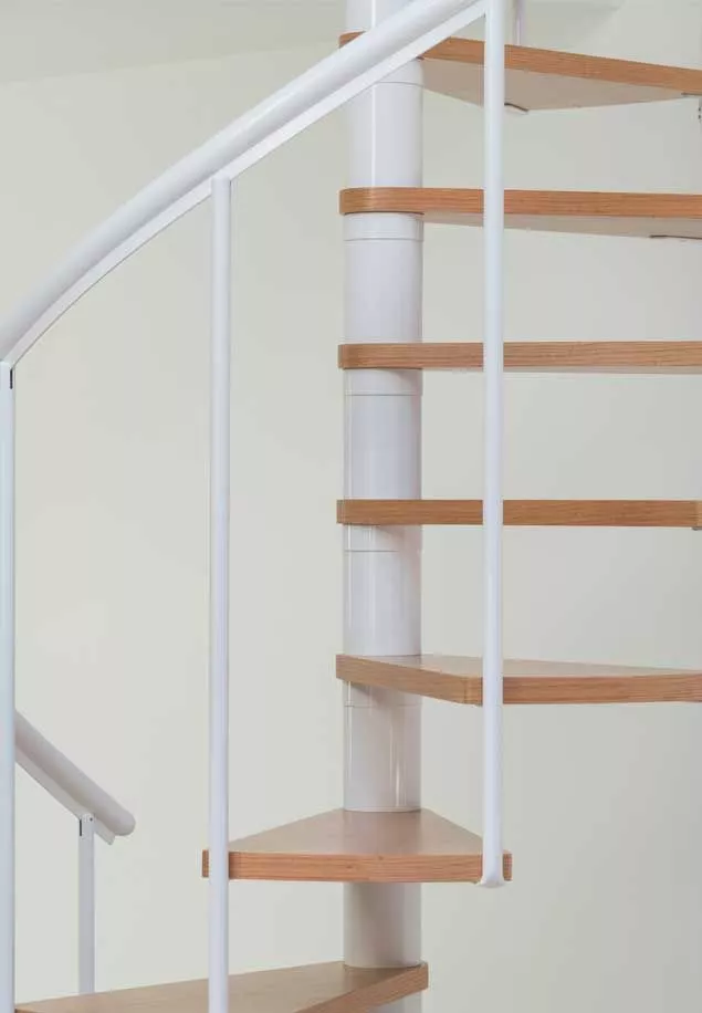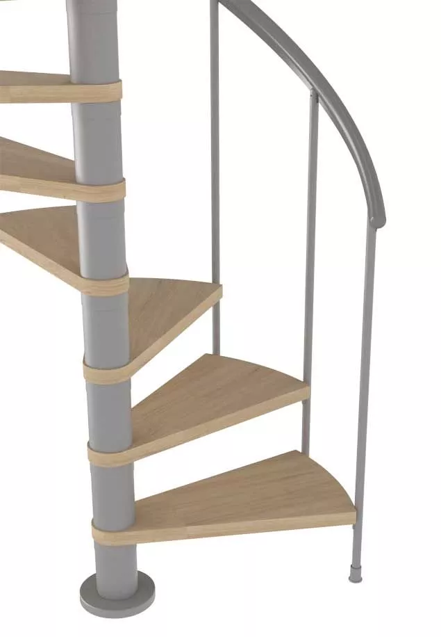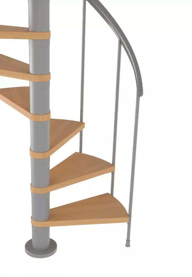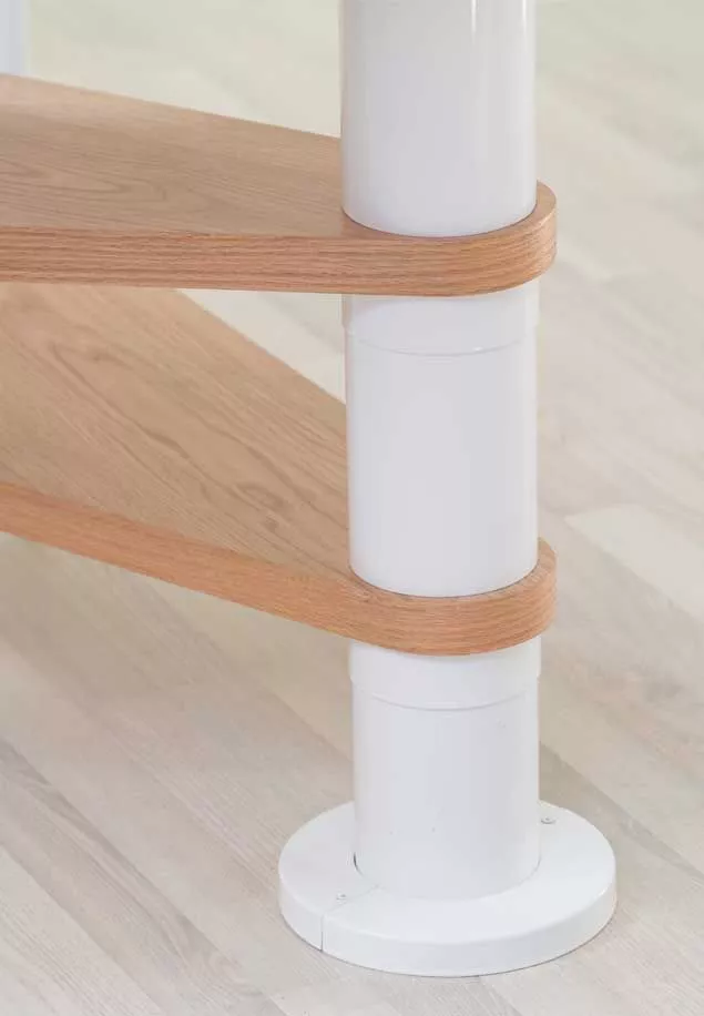 Zajmujące niewiele miejsca schody są wyposażone w 11 stopni z litego, lakierowanego drewna bukowego z czterema pionowymi poręczami na stopień, co zapewnia stabilność i komfort podczas użytkowania schodów. Metalowa konstrukcja schodów spiralnych wykonana jest z metalu malowanego proszkowo na kolor biały, antracyt lub szary. Wysokość można regulować różnie za pomocą pierścieni dystansowych od 21 do 23,5 cm w zależności od wysokości podłogi do sufitu.