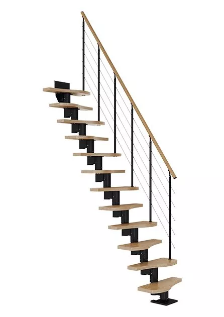 Schody BASEL są łatwe do montażu. Na pierwszy rzut oka mogą wyglądać jak zwykłe schody proste. Jednak dzięki specjalnie zaprojektowanym modułom każdy stopień można obrócić nawet o 22,5°. W ten sposób schody można dostosować do wymiarów pomieszczenia. Potrzebujesz inspiracji? Zapraszamy do obejrzenia naszej galerii zdjęć! Balustrada została zaprojektowana z pięcioma poziomymi wypełnieniami ze stali nierdzewnej (6 mm). Tralki są montowane na górze stopni, aby zagwarantować maksymalną elastyczność i łatwy montaż. Górne elementy tralek wykonane są z malowanego proszkowo aluminium, które łączy w sobie elastyczne, solidne połączenie i wysokiej jakości wykończenie. Balustrada malowana jest proszkowo w tych samych nowoczesnych, półmatowych kolorach, co konstrukcja, natomiast poręcz wykonana jest z litego drewna. Tak proste, a jednocześnie tak eleganckie!