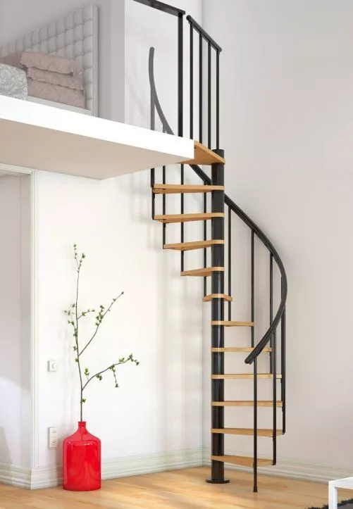 Schody ze stopniami z buku multiplex o średnicy 120 cm, ich konstrukcja oraz balustrada są malowane proszkowo na kolor antracytowy (RAL 7016). Schody przeznaczone są do wysokości kondygnacji do 280,8 cm.