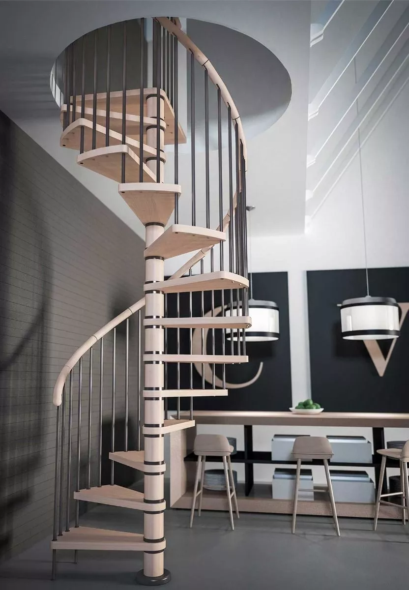 Tralki i pierścienie schodów są metalowe, lakierowane na kolor szary – RAL 7012.