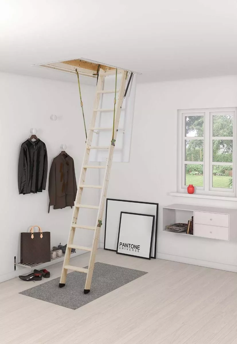 Warstwa izolacyjna oraz specjalna konstrukcja ograniczają straty ciepła. Model DOLLE clickFIX® 36 Gold posiada stopnie antypoślizgowe podnoszące bezpieczeństwo oraz drewniany drążek ułatwiający ich otwieranie i zamykanie.