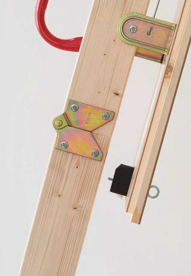 Specjalnie skonstruowany system regulacji ułatwia szybkie dopasowanie wysokości drabinki schodów, a drążek ułatwia ich otwieranie i zamykanie.