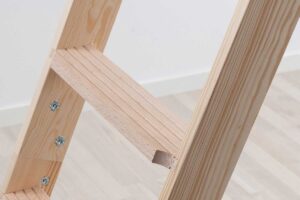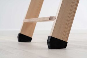 Drabina schodów wykonana z sosnowych elementów bocznych oraz 12 antypoślizgowych bukowych stopni, z czarnymi antypoślizowymi stopkami dla ochrony podłogi przed zarysowaniami.Drewniana drabina jest łatwa w obsłudze, wysokiej jakości, stabilna.