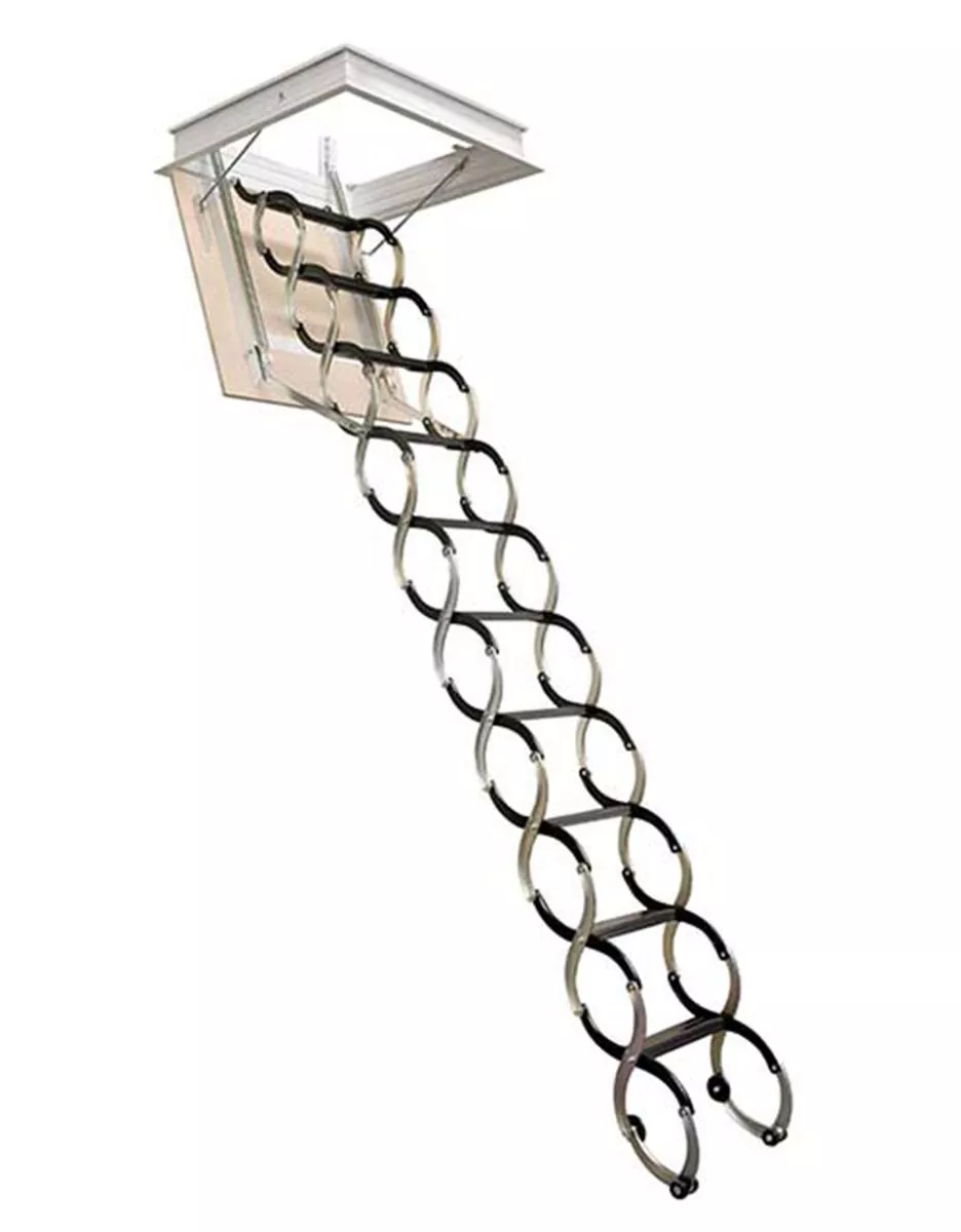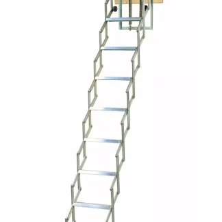 Schody z antypoślizgowymi, wygodnymi stopniami. Drabinka schodów jest skręcana, w kolorze czarnym z elementami ocynkowanymi. Ich skrzynia jest biała, metalowa, jej montaż jest ułatwiony ponieważ nie ma problemu z zachowaniem kątów prostych.