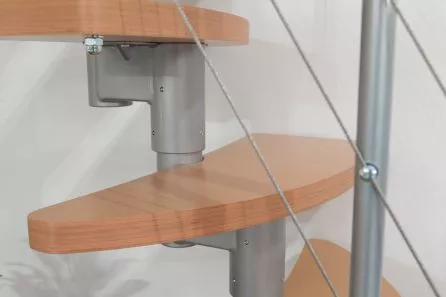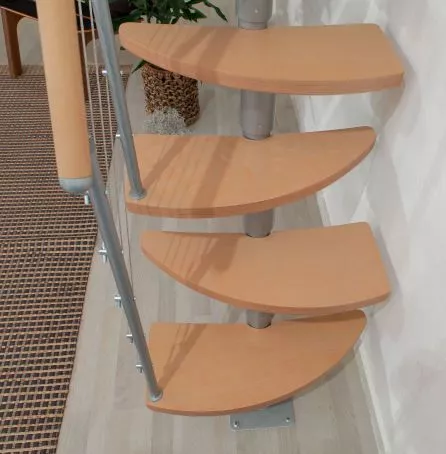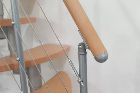Metalowa konstrukcja oraz balustrada są malowane proszkowo na kolor srebrny, a stopnie wykonano z lakierowanego buku multiplex. Balustrada ma poręcz z masywnego drewna bukowego i stalowe linki o średnicy 3 mm, co nadaje całości lekkość i elegancję.