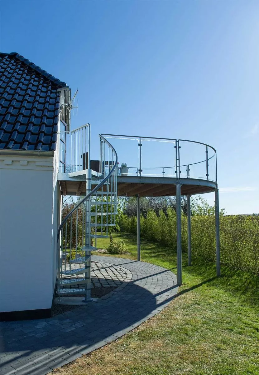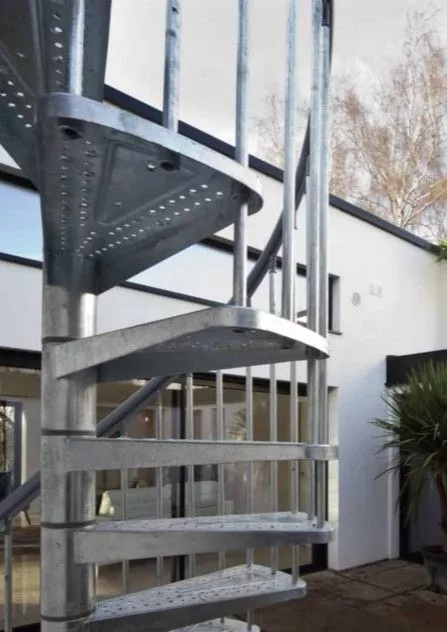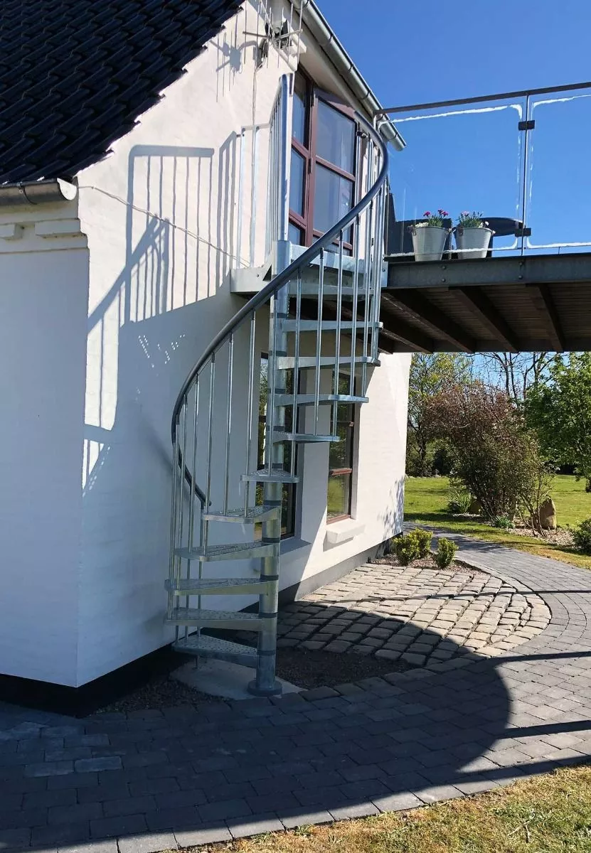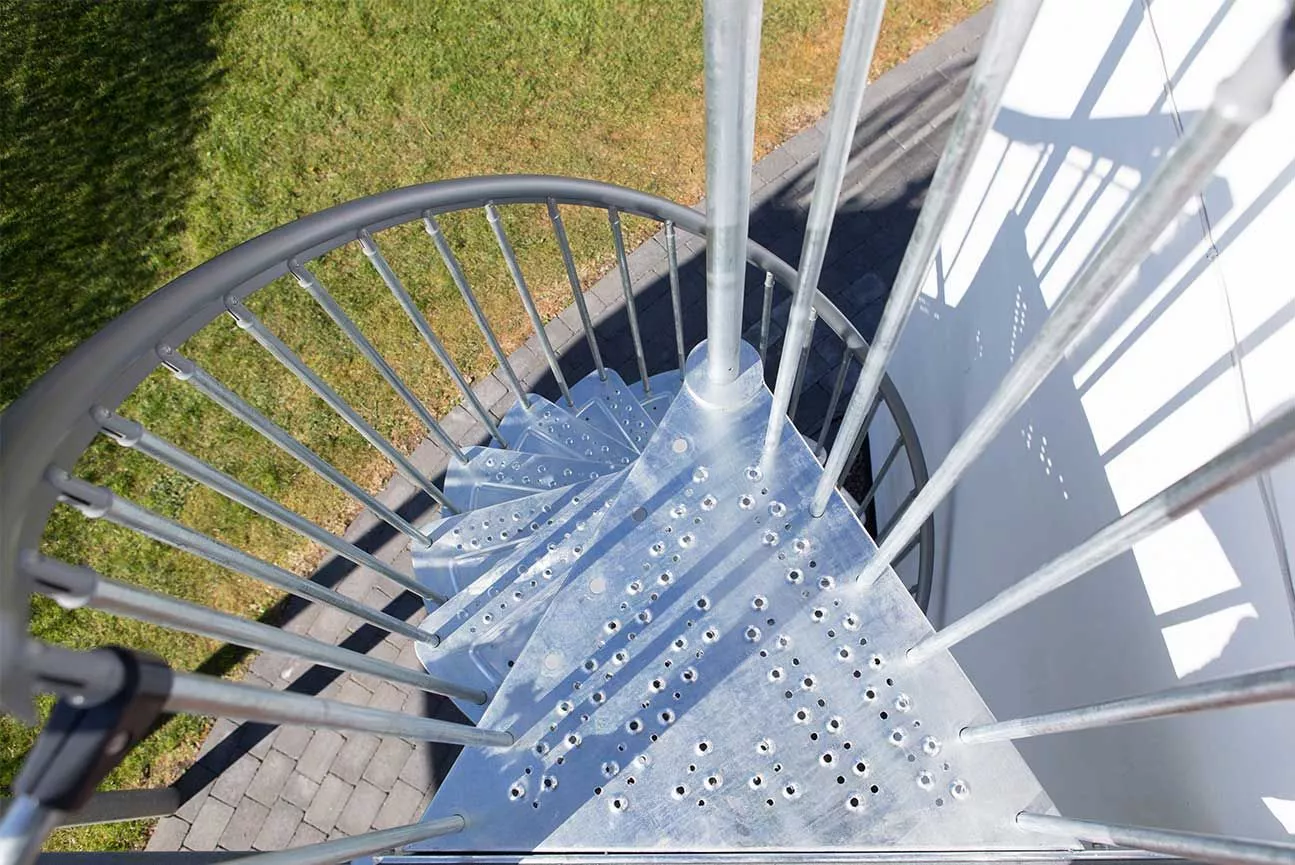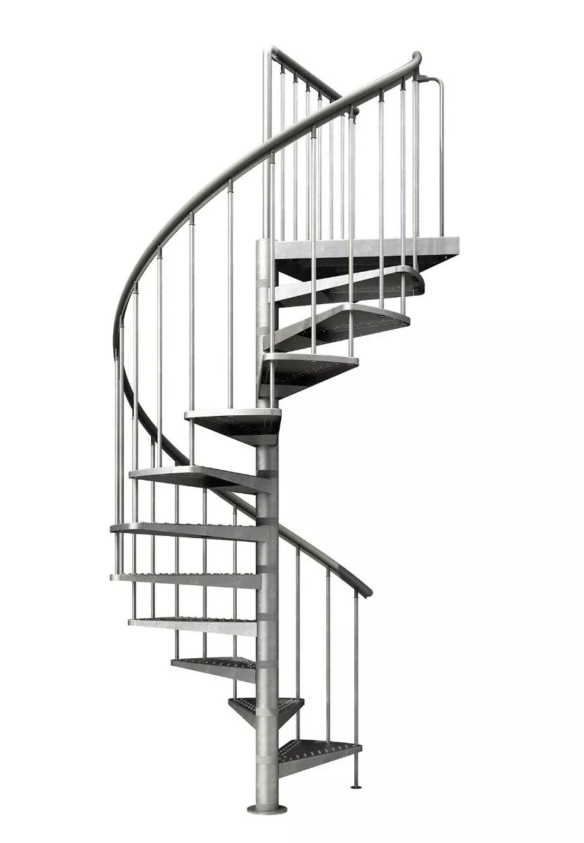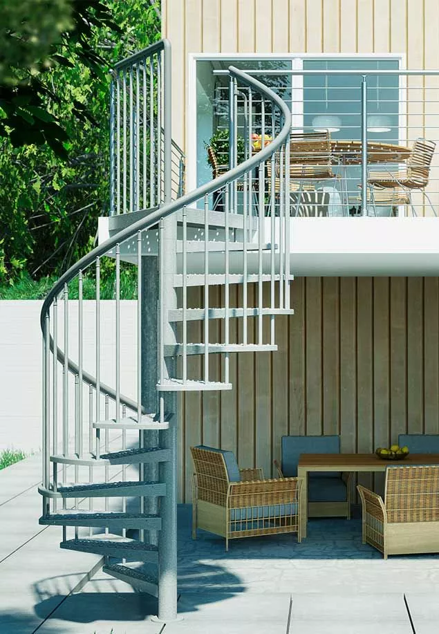 Schody spiralne TORONTO firmy DOLLE nadają się do użytku zarówno wewnątrz, jak i na zewnątrz budynku.