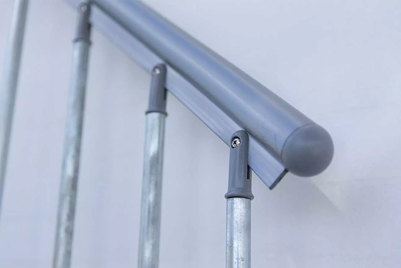 Zestaw obejmuje: konstrukcję, poręcz, tralki, stopnie oraz elementy montażowe. Okrągłe tralki są ocynkowane ogniowo i zakończone poręczą z szarego tworzywa sztucznego (PE).