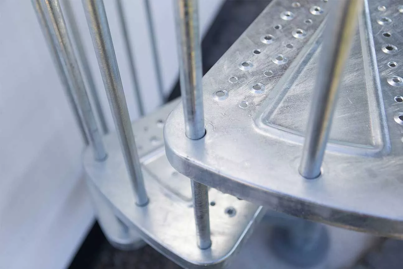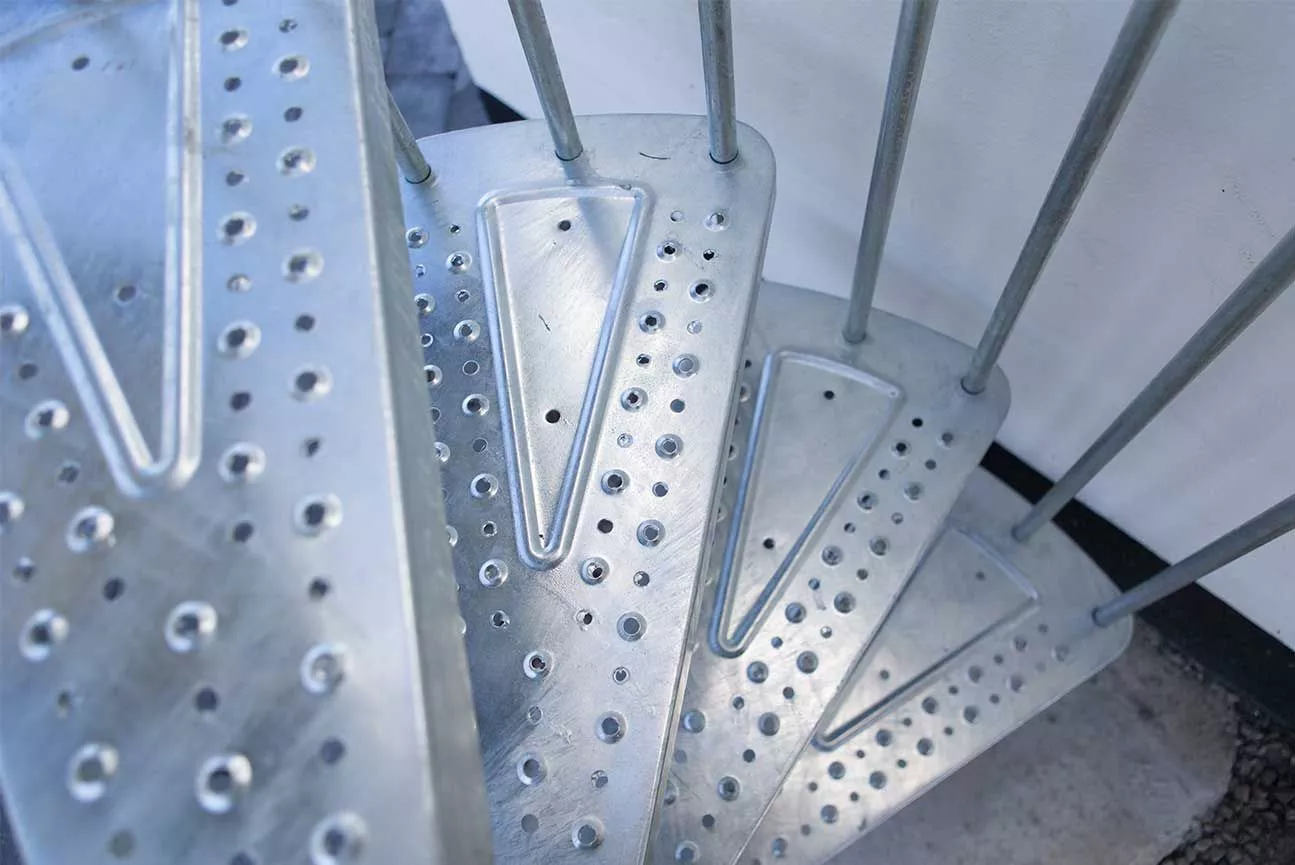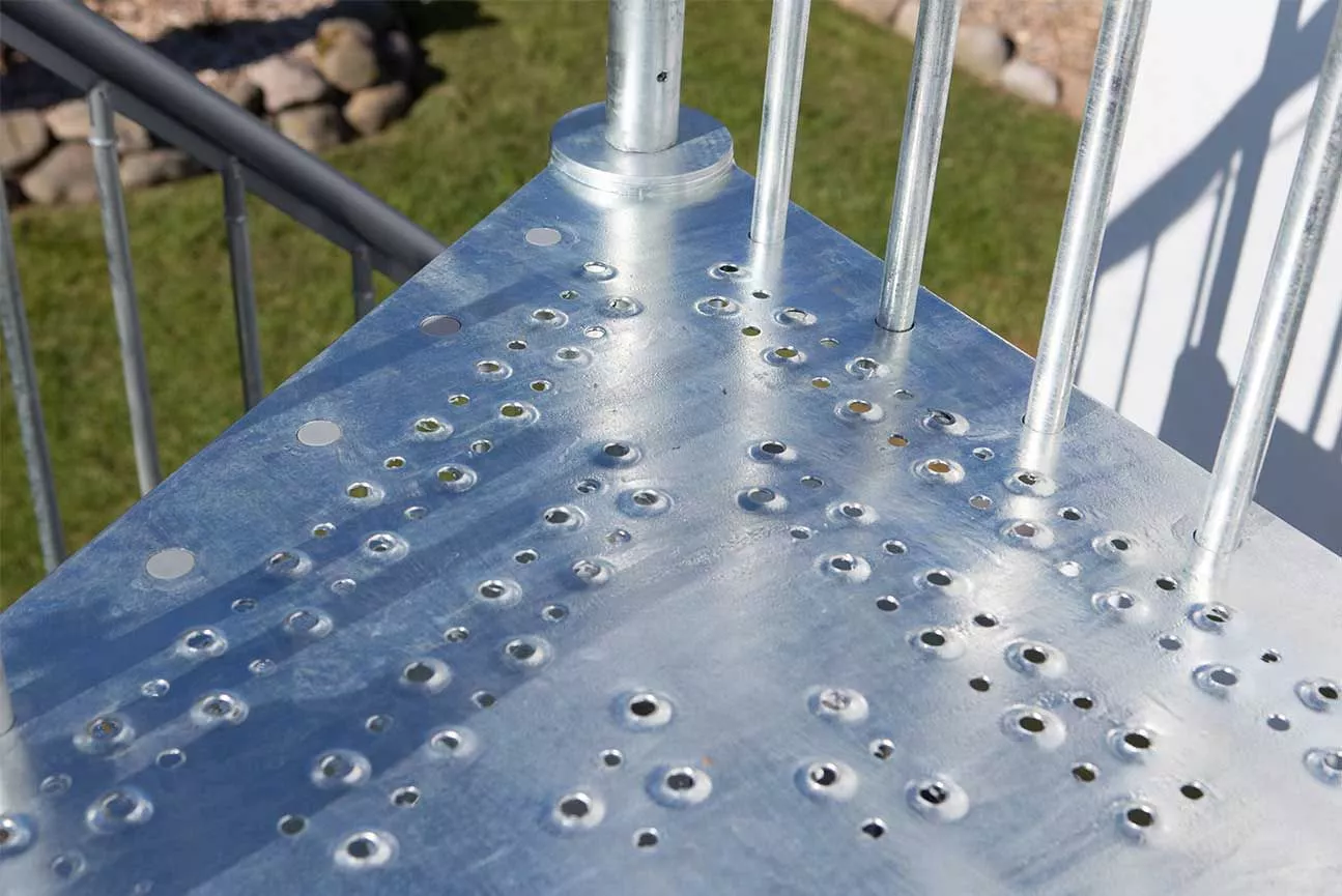 Schody posiadają perforowane stalowe stopnie, dzięki temu są bardzo trwałe, bezpieczne i komfortowe. Sposób perforacji stopni zapewnia skuteczne odprowadzanie wody i chroni użytkownika od poślizgnięcia. Są łatwe w utrzymaniu i czyszczeniu.